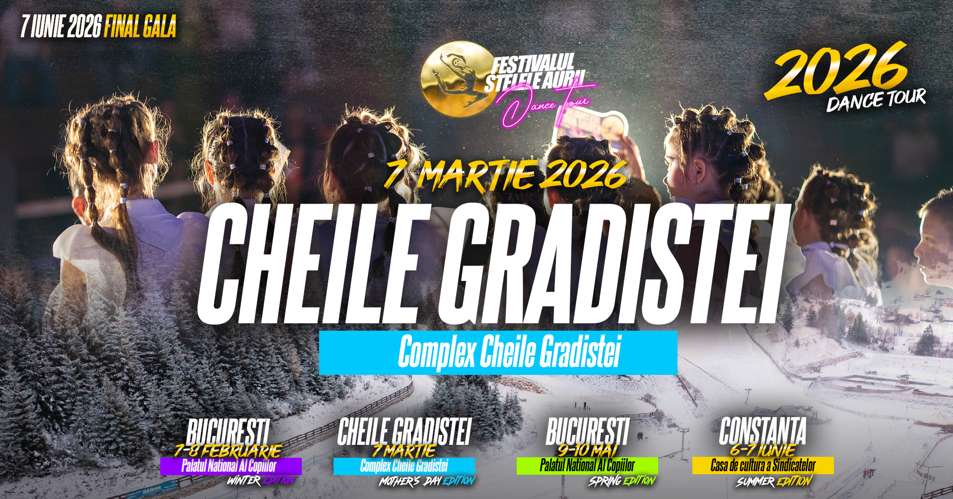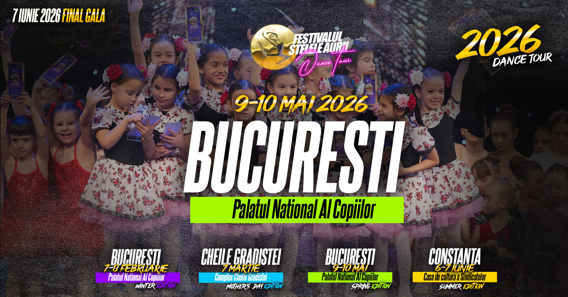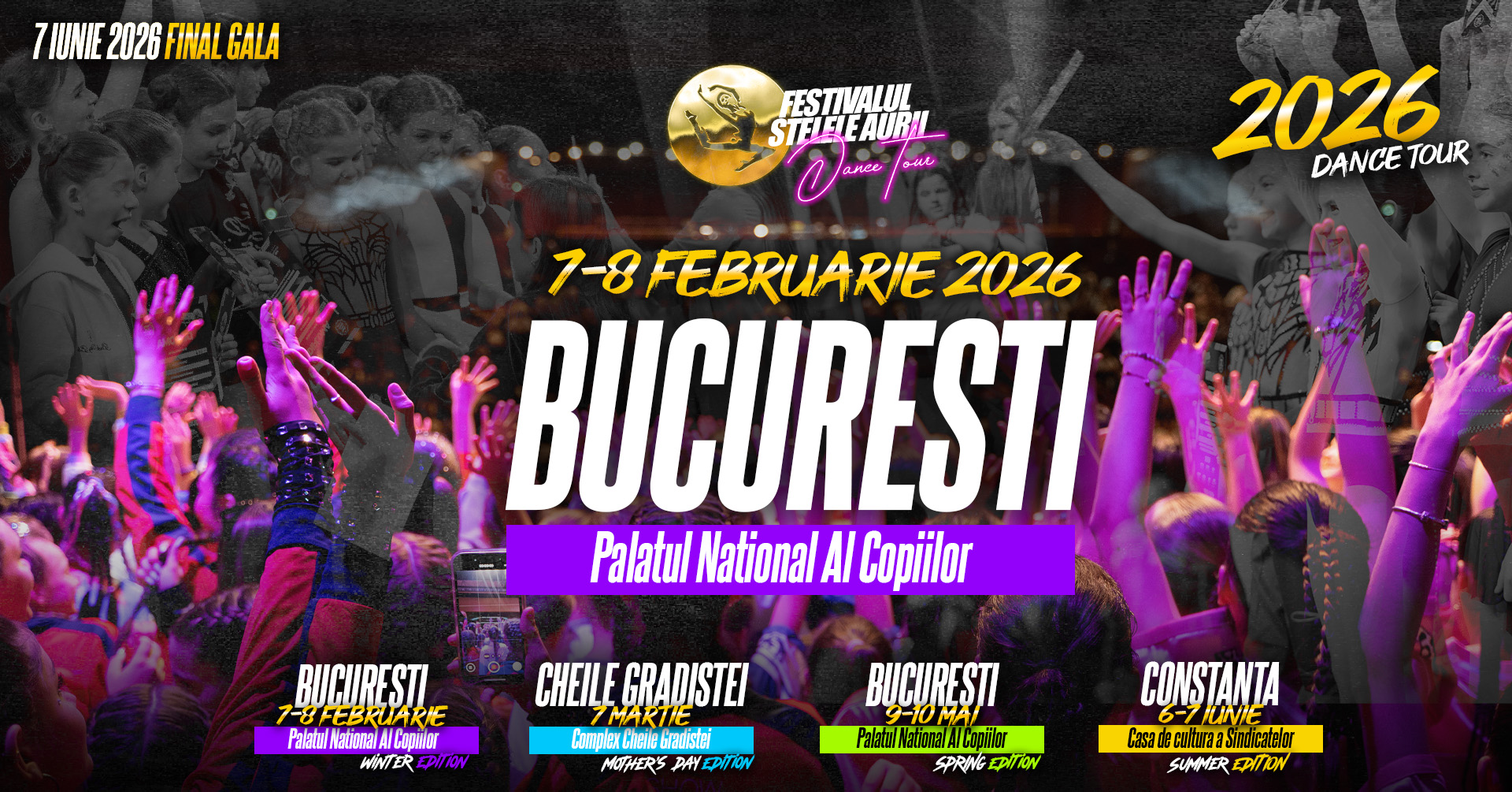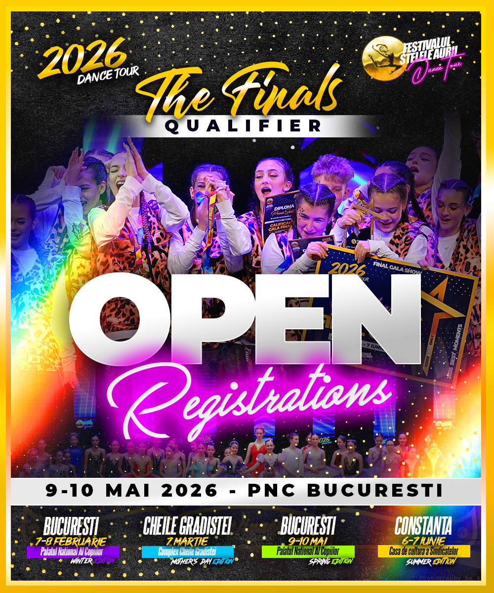 “Golden Stars” is one of the most prestigious contests dedicated to children and young dancers in Romania, bringing together thousands of participants each year from dance clubs and schools across the country. The event offers participants the opportunity to perform on stage in a professional setting, to be evaluated by a specialized jury, and to showcase their talent in multiple dance styles and age categories. Registering for the competition represents the first step toward recognition, performance excellence, and stage experience in a national tour that culminates in a final gala dedicated to the best dancers.”