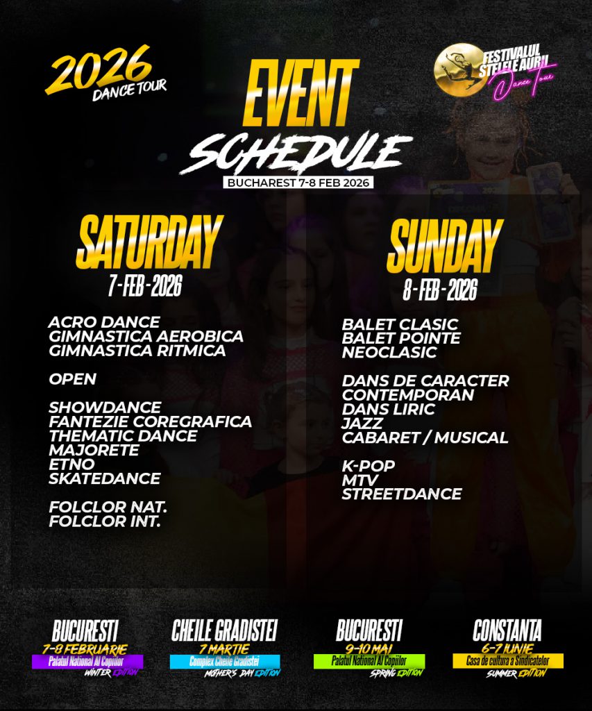 6. By registering for the festival, participants (dancers, teachers, coaches, choreographers) grant permission to the organizer, Asociatia Culturala Stelele Aurii, to use any media content in which they appear (photographs, video recordings, etc.). Participants shall not be entitled to request any financial compensation or material benefits in exchange for the use of such media content.