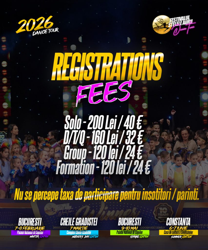 6. By registering for the festival, participants (dancers, teachers, coaches, choreographers) grant permission to the organizer, Asociatia Culturala Stelele Aurii, to use any media content in which they appear (photographs, video recordings, etc.). Participants shall not be entitled to request any financial compensation or material benefits in exchange for the use of such media content.